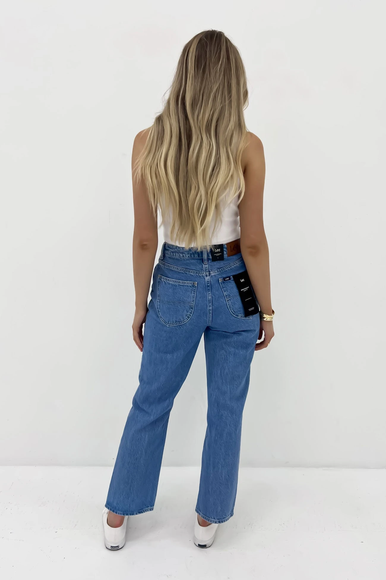Inspired by the Lee archives, the High Straight Features a super high waist with a fitted top block and a straight leg profile thats slightly cropped at the in leg, finishing just above the ankle. Reminiscent of your favourite hip hugging vintage jeans they have been finished in a bright, mid blue wash with contrast heritage stitching.