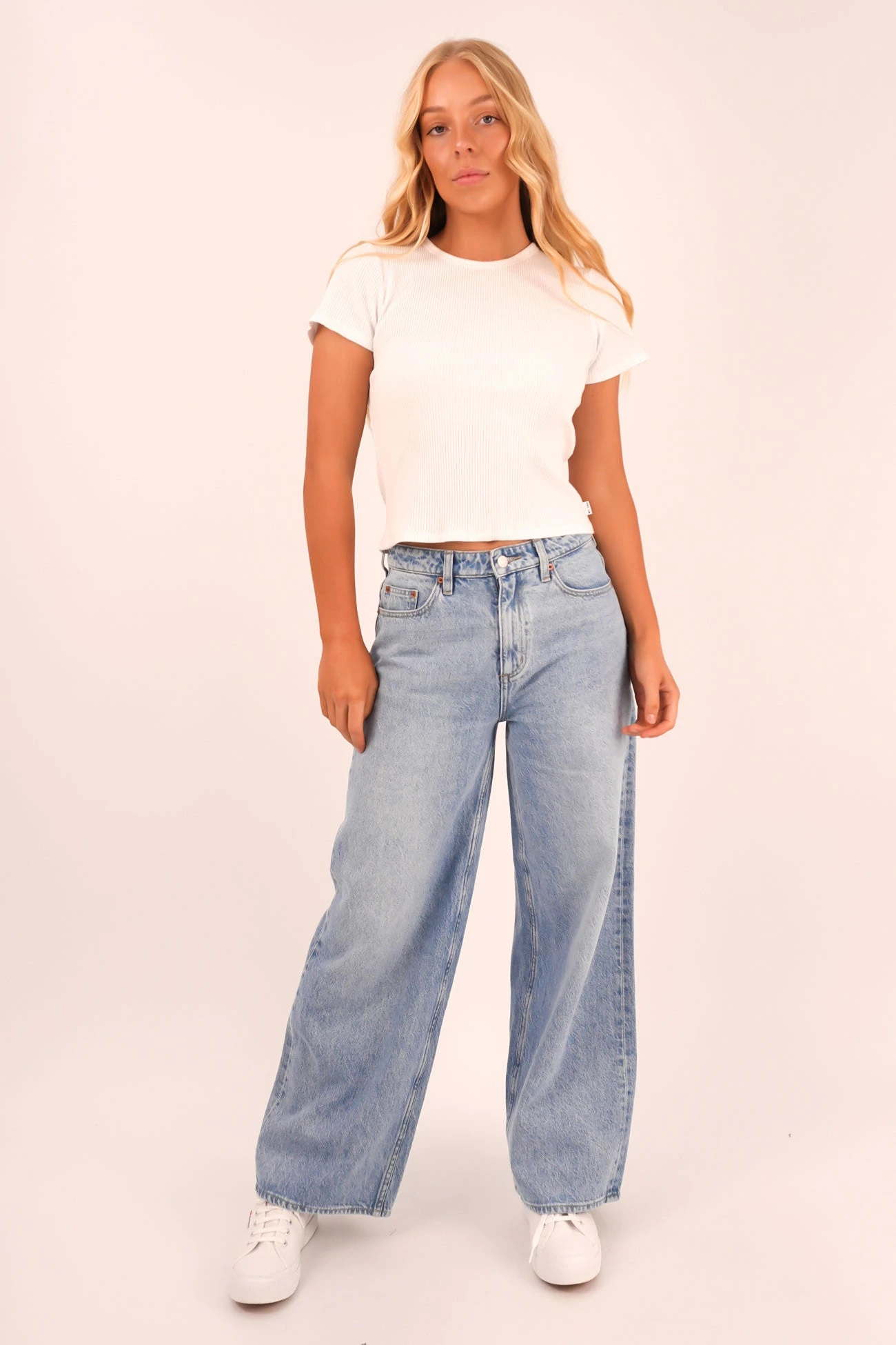 This season we introduce the Mid Slouch to our fit library. The Mid Slouch is our most relaxed profile jean. Designed to sit mid rise, and fit loose and extra baggy through the leg profile to stack on your shoe. Made in a soft, non stretch denim and finished in a worn bright blue wash.