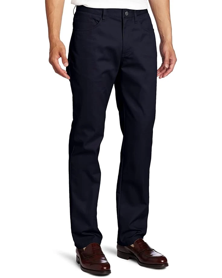 55% Cotton, 45% PolyesterSKU: #9625321Viet NamMachine WashFlat-front pant featuring denim-inspired five-pocket styling and contoured waistbandBlack38Wx32Litem package weight: 1.0 pounds